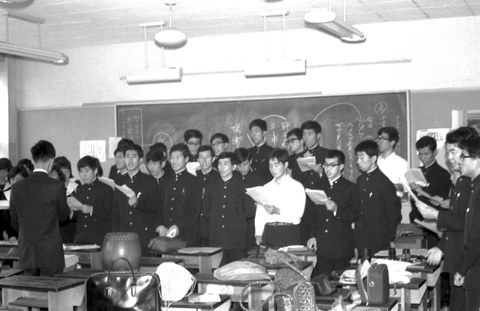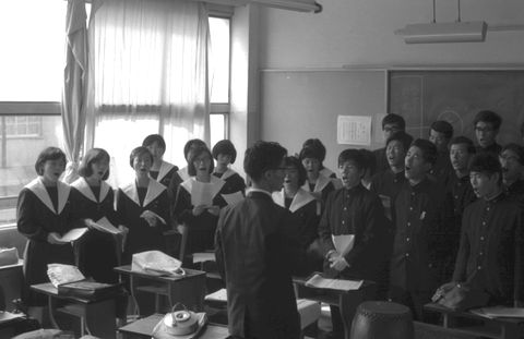 1966年10月わがクラスは担任の先生を指揮者に担ぎ出し(嫌な顔はしたがやってくれた)参加、どんな歌を歌ったのかは覚えていない。 クラスで55人のうち女子は13−4人のみ、纏まりの良いクラスで今でも毎年正月に先生とクラス会をやっている(コロナで中断中だと思うが)。 上の2枚は教室での最終練習の風景、指揮は担任のT先生。 |