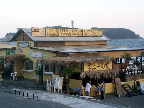 海開きした片瀬西浜海水浴場平日なのでまだまだ混んでいない、いつものポニーがいる海の家も出来ていた。 海の家の利用料は大人1500円、シャワーだけでも800円、飲み物も食べ物も結構高い。 |