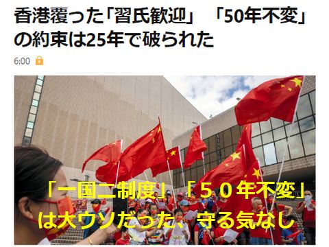 「50年間、一国二制度で安心」は大インチキだった香港返還時には「安心できる一国二制度で」と言ったが25年で約束をサッサと反故にして 民主派や民主マスコミを弾圧して強権政治をする中国共産党。次に狙うは台湾?でもウクライナ侵攻の失敗で難しくなったかも。 |