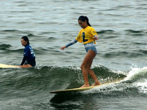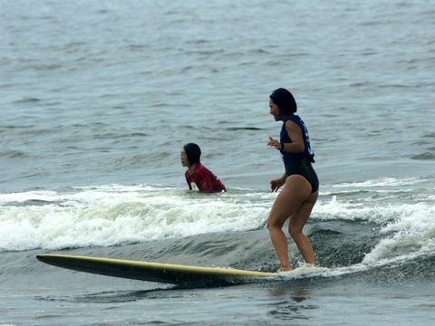 女性の種目は花があるこれは昔の重いボードをそれも抽選で与えられてサーフィンするというプロ級の競技。 さすがにベテラン級の選手は上手だが波がいまいちなのは残念。 |