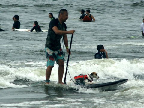 犬のサーフィン種目もあり犬が自分で参加エントリーする訳もないがDOG競技、他にはSUP(ボードに立って乗りパドルで漕ぐ)も。 |