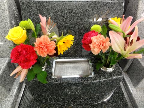 雨がぱらつく中、墓参りに暑くなって花が持たなくなって前回の花は全滅でからっぽになっていた。 |