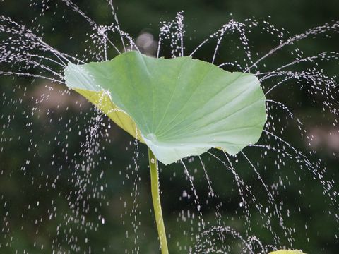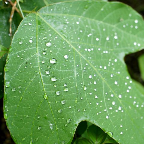 傘をさして公園へ散歩に南風が強いが木の陰を進むと楽、雨粒の付いた葉っぱが綺麗だが風が強く撮影は難しい。 |