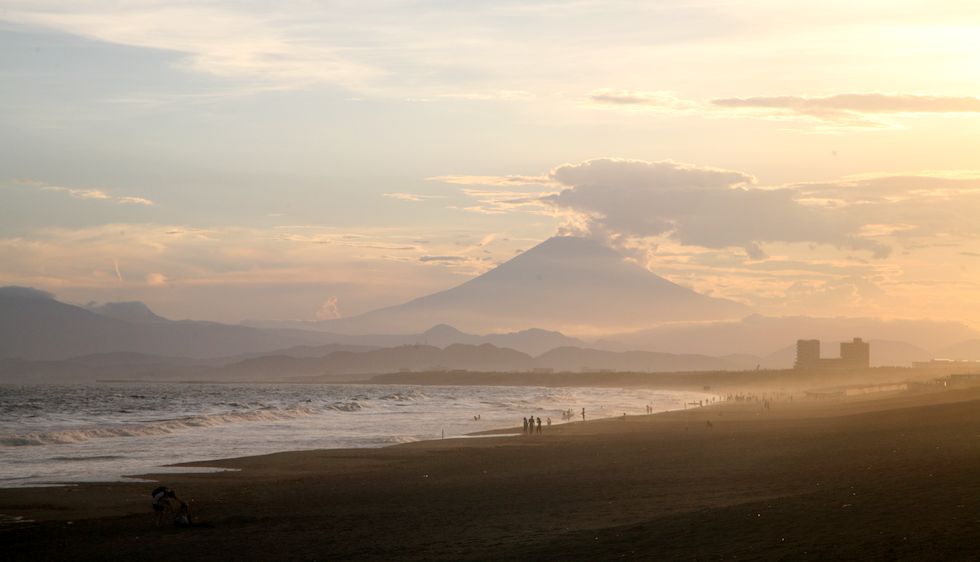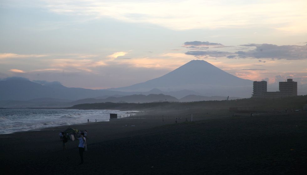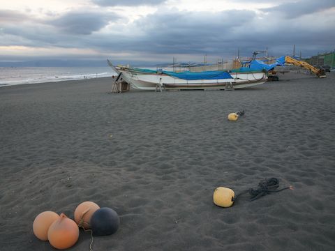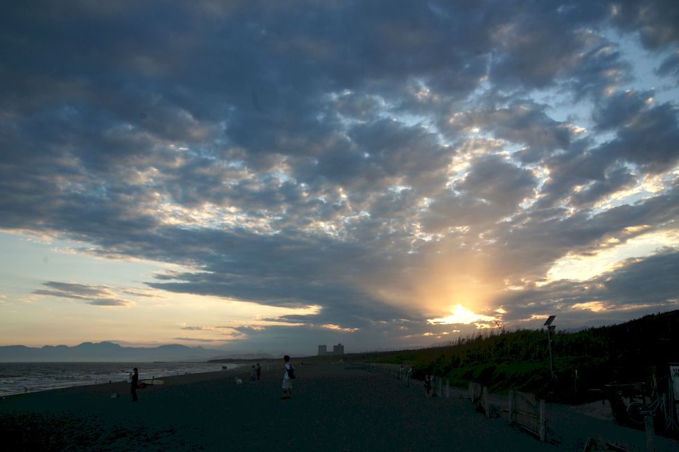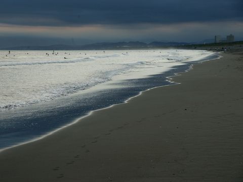 静かな海岸、サーファーはいるが「カツオノエボシ」騒動は収まったよう、辻堂海岸の海開きは明後日の土曜日から。 |
