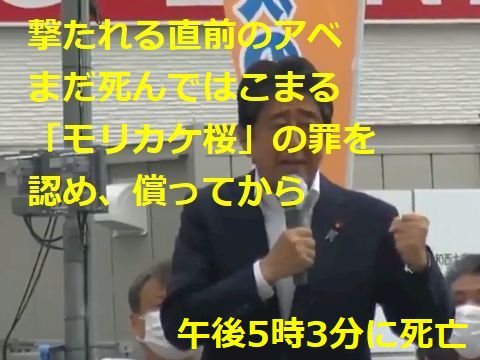 アベが撃たれる、まだ死んでは困る奈良・近鉄西大寺駅前で演説を始めてまもなく後から銃撃され「心肺停止」、ドクターヘりで大和八木駅近くの 県立大病院へ運ばれたが失血死で死亡。 |