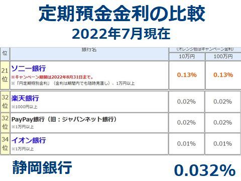 定期預金金利の比較これまで金利の良かった静岡銀行へ定期預金をしていたが金利があっという間に下がり他行並み(それでもまだ少しまし)。 これでは1000万円で1年間の金利が3200円、税金を引かれると2560円しかない。少しは良いソニー銀行(口座はある)への 移動を検討、期待できる金利は1年で10400円、送金手数料は220円かかるが。 |