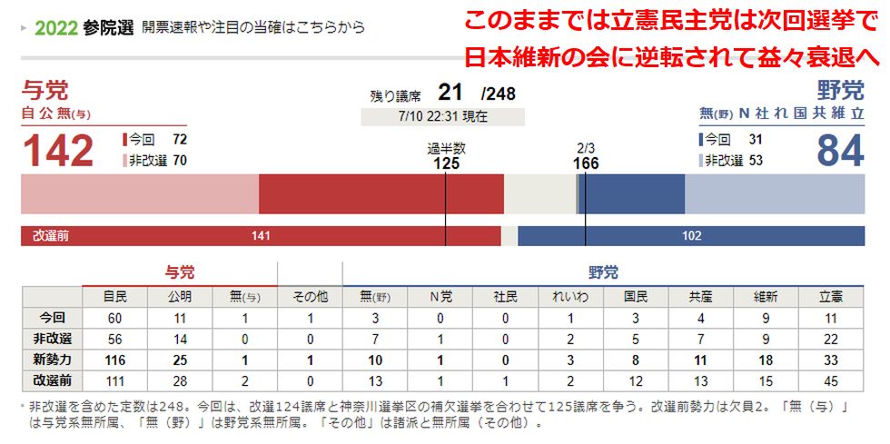 参院選・与党勝利の結果に不甲斐ない立憲民主党、日本維新の会の全国展開などで後塵を拝する選挙区も、次の3年後の参院選まで巻き返しが できないと更に落ちぶれるのは確実に。 |