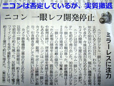 ニコン、一眼レフ撤退報道日経などが報じたがニコンは否定のコメント、でも実際はもう開発は中止、販売機種も激減で実質撤退。 キャノンでも新規の一眼レフはもう出ない見込み、でも既存機種は維持が違うところ。 |