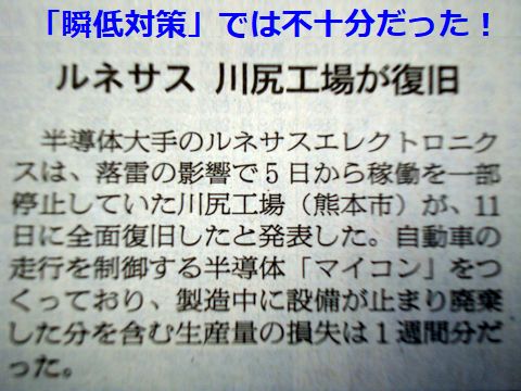 瞬低対策が不十分だった?どうやら0.1秒までの瞬低対策はしていたようだが想定外の長い電源断でラインが停止となったよう。 工場全体をUPSでバックアップする訳にもいかず、どういう対策を取るのか大いに興味あり。 |