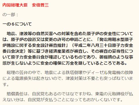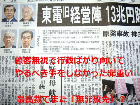 東京電力幹部に13兆円超の賠償判決株主訴訟での判決だが一般常識からいえばごく当然の内容、官僚ばかり見て現場の安全を手抜きした償いは必須。 でも最高裁まで行くと政府の顔色をうかがうような判決で「無罪」になる危惧が大。 国会で大嘘をついたアベ自民党も同罪だから分担して払っては、との意見も。 |