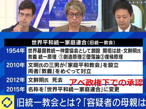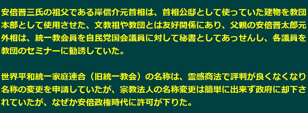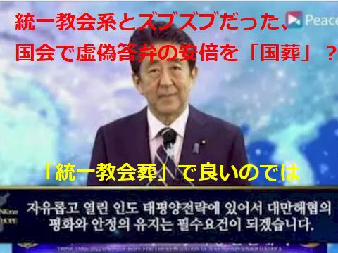 安倍と統一教会一派との関係は常識?旧統一教会が記者会見、団体は2つあり異なるとか献金はこの9年は受けていないなど大嘘の内容に終始。 安倍はよき理解者でお祝いのビデオメッセージを貰ったとの発言もあり・ |
