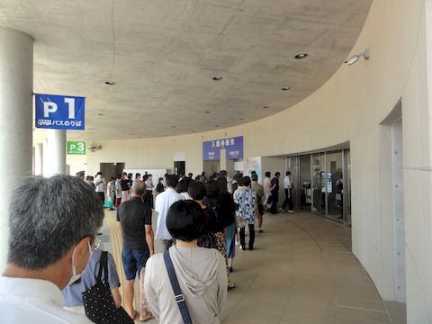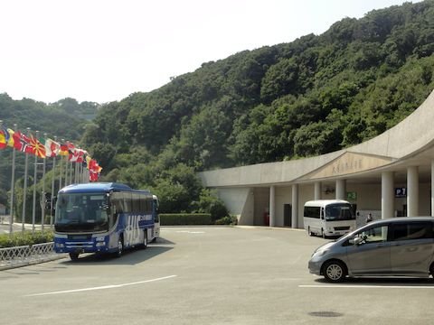 鳴門線で鳴門駅へ、路線バスに乗り換え7時30分の鳴門行で移動、ちょうど通学時間で結構な混雑、この鳴門線は乗客が少なく廃止検討路線に入っている。 鳴門駅前でバス待ち、前回より駅前がきれいになり足湯も出来ていた。バスで15分程で美術館前のバス停へ到着、 もう開場を待っている列あり、20−30人+団体1組。 |