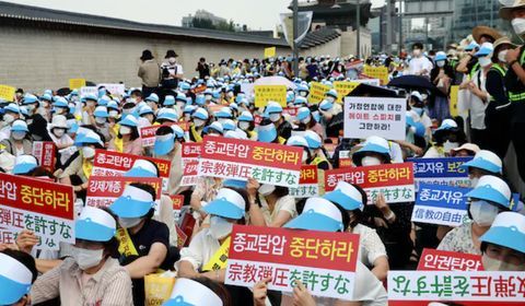 韓国での統一教会デモは「無視」韓国では「カルト集団」との認識でマスコミからは完全無視、皆が同じプレートをもっているのは教団から与えられたものだから。 デモ参加者も「動員された」人たちばかりのよう。 |