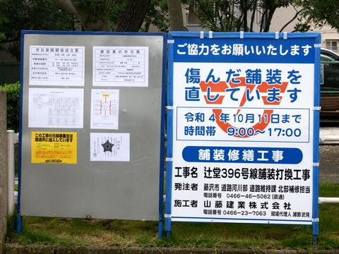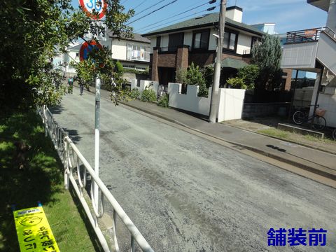 舗装の修繕工事が始まるが藤沢市も予算逼迫で道路の補修はままならない状態、マンション内の公道部分も繰り返し陳情してやっと行われた(32年経過)。 この道路部分は40年近く経過のはずで、ひび割れもひどく放置すると埋設の下水管や水道管の破損に繋がる恐れもある。 |