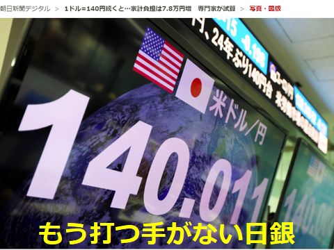 円安140円も無策の日銀何も手を打てない日銀と政府、アベなど「1万円札は30円で印刷できる」と阿呆なことを触れ回っていた。 金利上げをしたくても出来ない状態に足元を見られて「円売り・円安」はどんどん進む。 ウクライナ侵攻や海運の混乱など悪い要因が重なる中「円安」で家計の負担は増えるばかり、無策の日銀は要らない?。 |