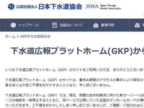 下水道プラットフォーム、アクセス殺到でダウン最近全く繋がらないのでおかしいと思っていたが、夏休みのアクセス集中でサーバーがダウンしていたよう、取り敢えずはPDF版のデーや配布で おお茶を濁しているが、サーバー増強が簡単に進むとは思えず。 |