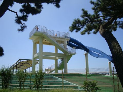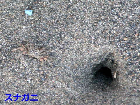 海岸ではスナガニが増えた一時はほとんど居なかったが最近は巣の穴を多く見かけるように、人がいると直ぐに穴に逃げ込むがこのカニはのんびり屋。 色が砂色?なので見つけにくい。プールは学校が始まったのでガラガラ。 |