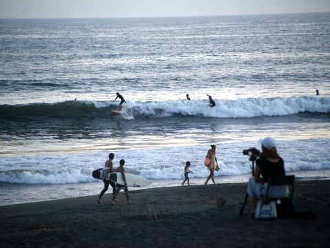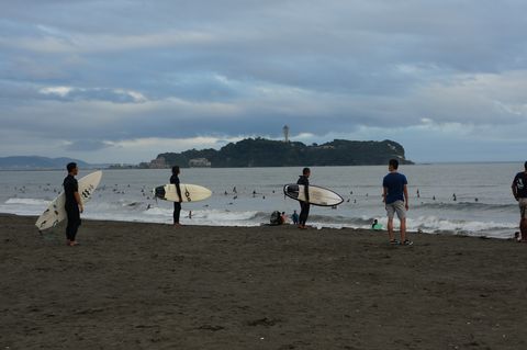 海岸は砂だらけ台風の余波で波はが高いのでサーファー多数、烏帽子岩の周囲も白波が眼立った。 |