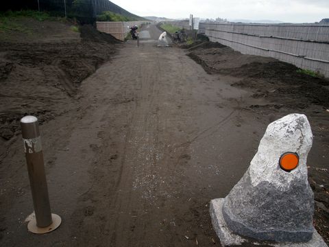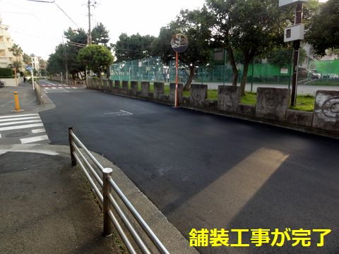 舗装工事が完了残っていたT字路部分の舗装工事が終わり、これで舗装工事は全完了となった。横断歩道の白線引きは後刻。 |