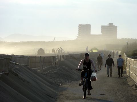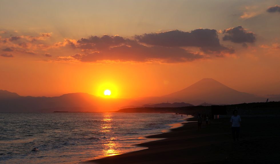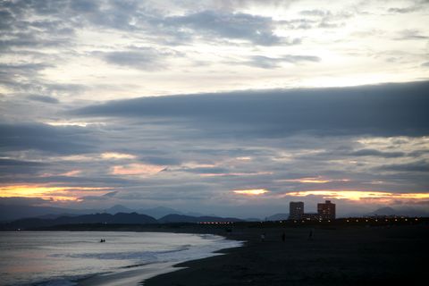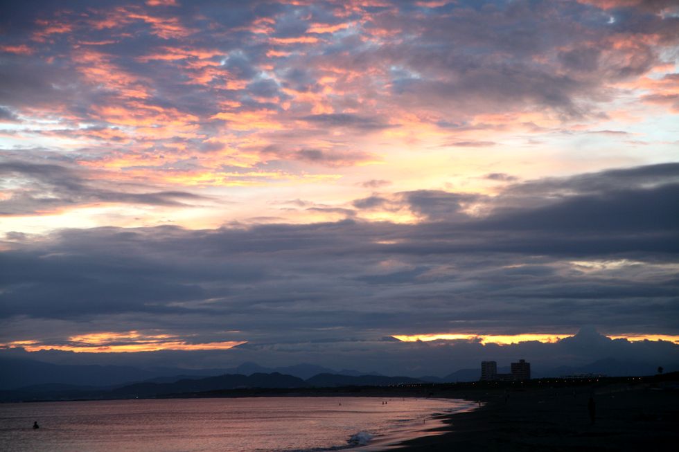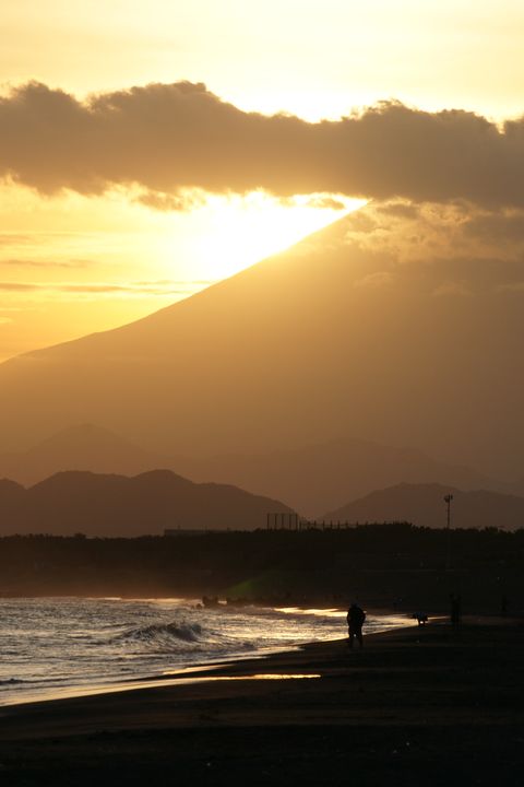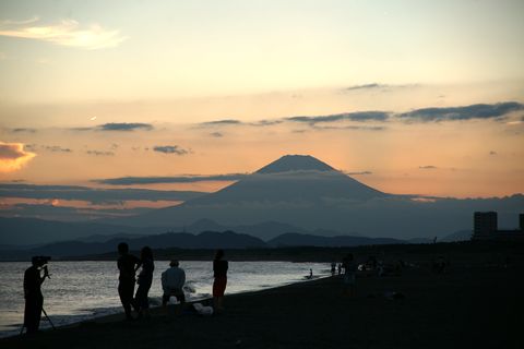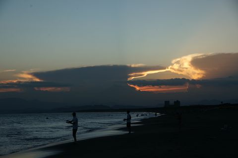 海岸には人が多いがさすがにカメラ・スマホでダイヤモンド富士を撮影している人は少数だった。 |