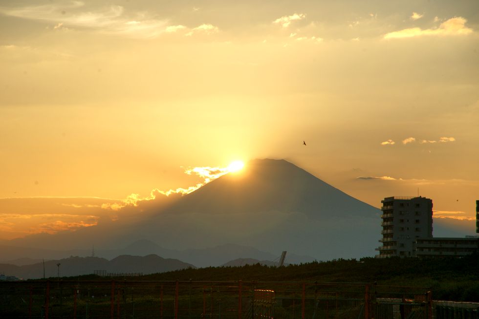 ダイヤモンド富士は過ぎた?太陽の沈む位置がもう富士山頂の南へ行ってしまったような感じの太陽の位置だった、残念。 |