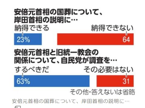 「国葬」実施にも国民の反応はより否定的に「納得できない」とする国民が前回より増加、「納得できる」との回答が1/4以下という結果は何? 「統一教会汚染」も形だけの「点検」でお終いにしようと、大悪人のアベは死んだからお構いなし、だと。 |