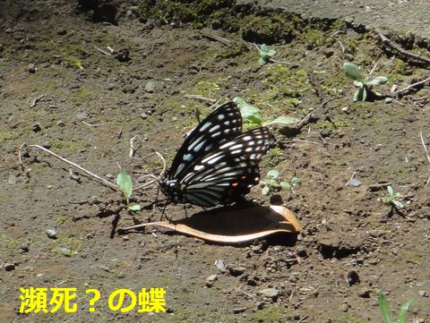 瀕死の蝶?ツバメがいなくなるとトンボが飛び回る時期に、霊園では瀕死の蝶が地面の枯葉にしがみついていた。 |