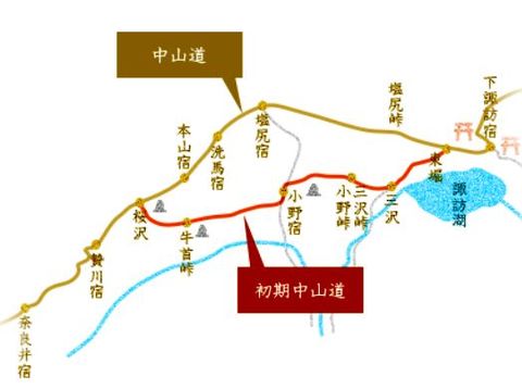 初期中山道の案内パンフ先日の中山道歩き時に塩尻の観光案内所で入手した2種のパンフ。一つは下諏訪〜木曽路まで(従来の木曽路パンフの補足)、もう一つは岡谷〜桜沢への 初期中山道の案内パンフ、現在の塩尻宿周りでなく手前の牛首峠を超えてゆくルート。 |