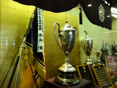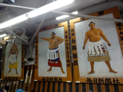 両国駅は「大相撲駅」構内には優勝力士の額(古いもの)や満員御礼の垂れ幕など多数、隣の観光案内所には土俵もある。 |