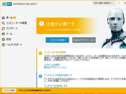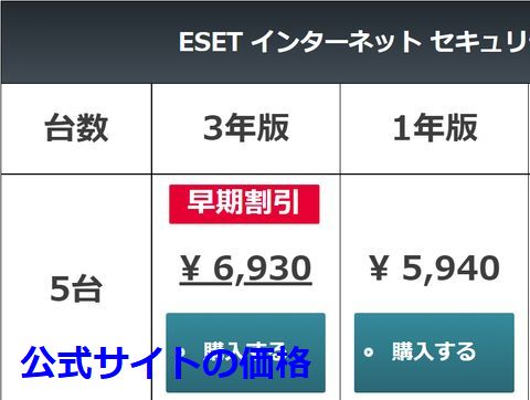 ウィルス対策ソフトの期限切れが近づいたESETの3年版へ切り替えてから早3年、期限切れとオンライン更新の案内がきた。新しいパッケージ版を買うほうが安いので あちこち探しクーポン利用で5250円を見つけて注文した。現在は3年5台版だが、この機会に3年3台版にスリム化実施。 |
