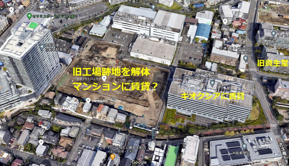芝浦メカトロニクス:旧工場跡地鎌倉芸術館となりのショッピングモールから芝浦メカトロニクスのビルを見る、キオクシアへ賃貸でこちら側にあった 芝メカのマークは駅側へ移されている。 |