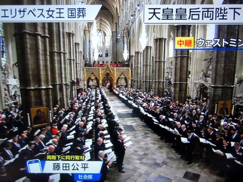 英・エリザベス女王の国葬日本時間午後7時からウェストミンスター寺院(英国教会、カトリックではない)で行われた葬儀には世界中から多数の元首級が参加。 中継画像はBBC制作で日本の天皇がどこに居るのかは解らず。 |