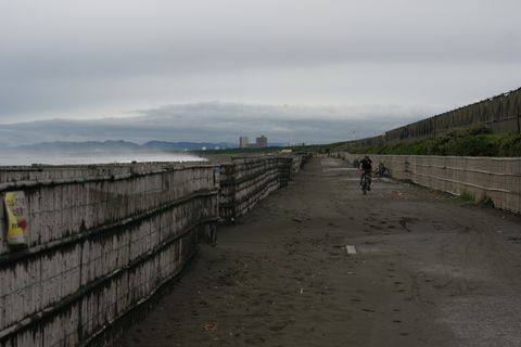白波立つ海岸、靄る風景風は涼しく暑さも一段落だが、歩くとやはり軽く汗をかく。 |