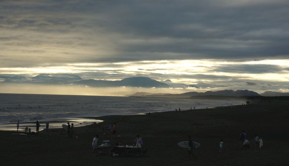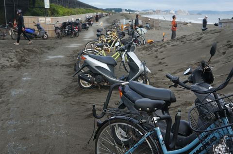 サーファーが溢れている台風15号が予報より早く抜けて、午後からは良い天気に。待ちかねたサーファーがどっと押し寄せて大賑わい。 |