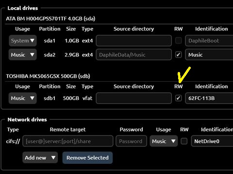 Daphile設定メインPCからFLACファイルをコピーするが、USB接続のHDDはネットワーク上には出てこず見えない。 そこでDaphile内でメインメモリ領域からUSB接続のHDDへはコピーしようとするも何故か出来ない。 原因はUSB接続ドライブを「R/W可能」に設定してないからだった。Settingで修正しコピー出来るようになった。 |