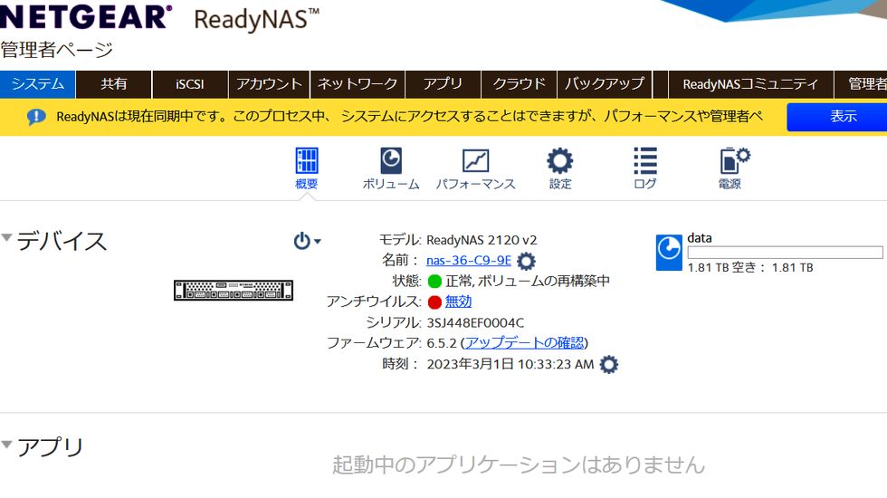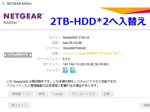 NASにHDDを追加して容量拡大へ再構築中2TB-HDDが2台だが、もう300GBしか残容量がないので、3台目のHDDを追加してRAID5構成にして増量すべく再構成中。データ残存のHDDでも 取付後に「廃棄」処理をすれば使えることがわかった(従来は初期化をしてから取付ていた)。 |