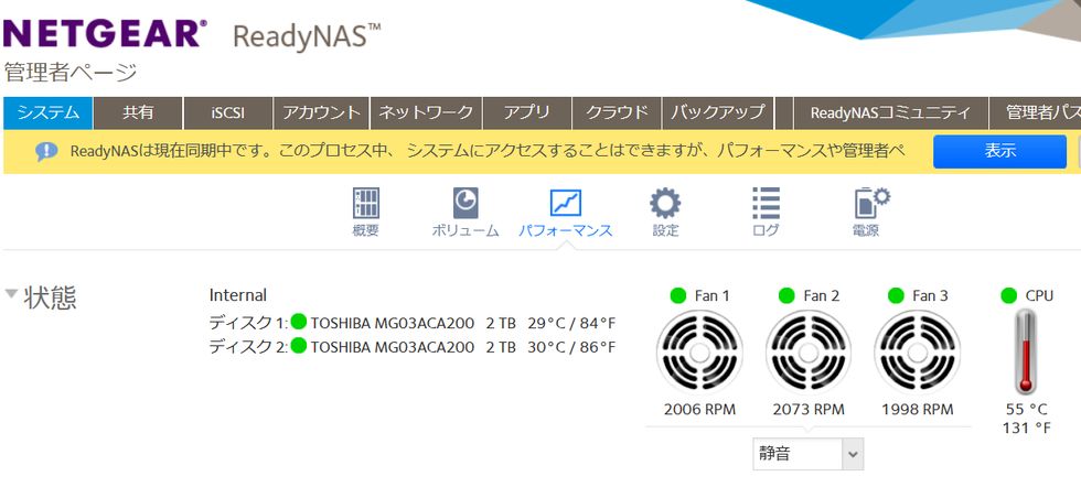 NAS世代交代でHDDを移設従来のReadyNAS DUO v2に入れていたHDD(東芝製2TB*2)を移設すべくデータを保存し、取り出したHDDを初期化する。 これは新品で購入したものなのでまだ使用時間は極少ないので安心して使える(連続稼働にも耐えるだろう)。 |