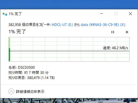 大容量のデータをNASへ転送中まあサイズが大きいので時間が掛かるのも仕方ない、USB3.0接続の外付けHDDからの転送で400MBPS位は 出ているので良しとする、じっくり待つしかない。 |