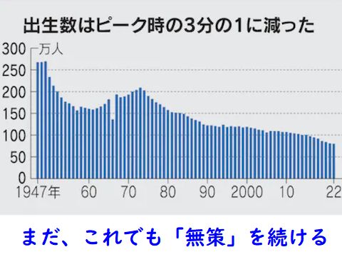 無為無策30年で出生数激減、将来の労働力も大幅不足に「異次元の改革」と口先ばかりの岸田政権、この無策の30年の反省もなく、人気取りのバラマキ政策 ばかり。どうせ国会議員達は全員死んでいて痛みも何もないので切迫感全くなし。 |