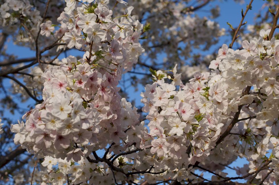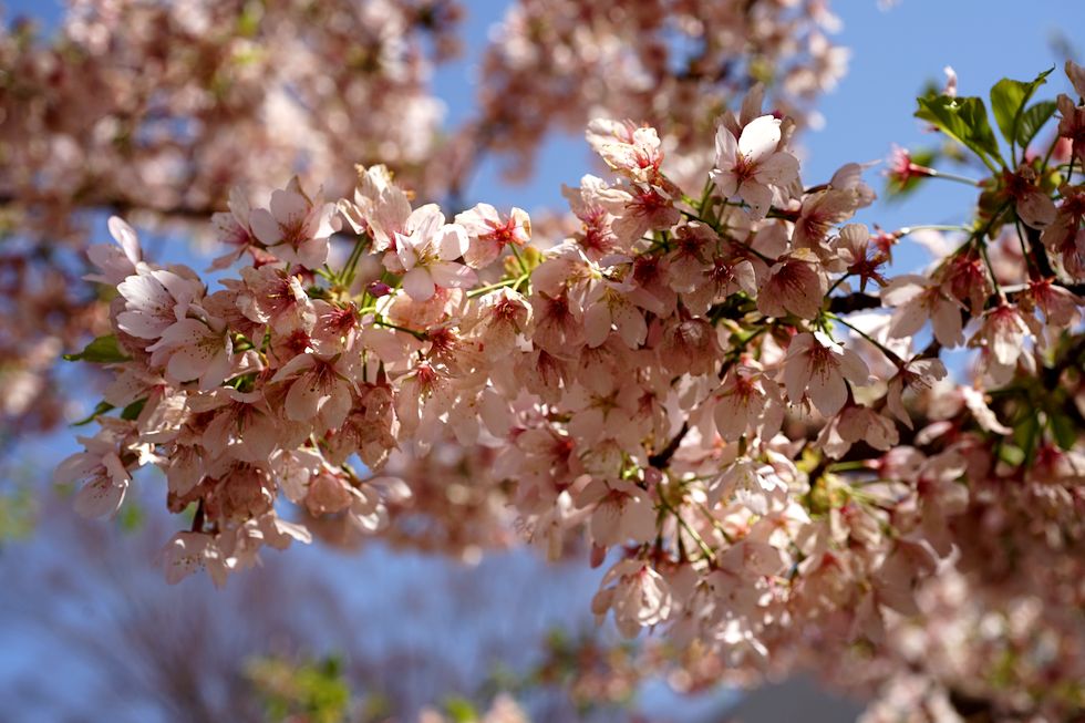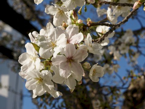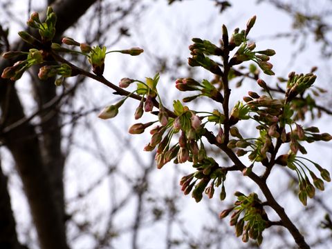 桜があちこちで咲き始めた早咲きの桜はもう満開過ぎ、普通の桜がつぼみが膨らみ、赤くなってきている。一部では咲き始めている。 |