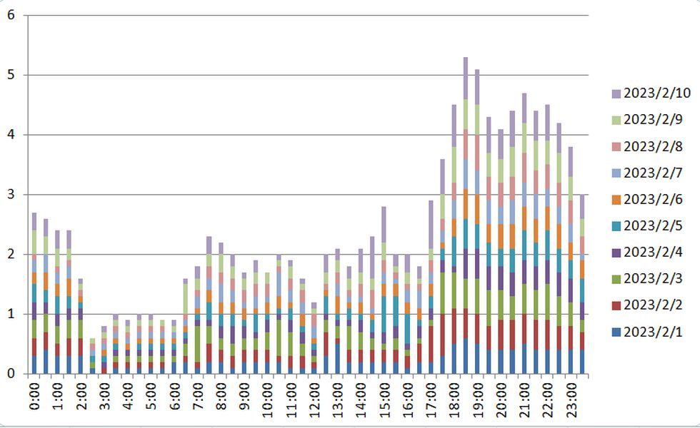 2月上旬の電力消費量をチェック2月1日から10日までの10日間の30分単位の電力量を積算したグラフを作成、夕方から深夜2時まではエアコンの消費に よるもの、日毎の変化は少ないように見える。 |