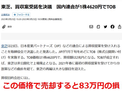 東芝のTOB価格が低すぎてプレミア分が低すぎてTOBが成功するのか怪しい、日経記事でも個人株主が5000円以上で入手が多い、 としており(当方は6000円)TOBに応じる可能性が低いのではとの観測。 |