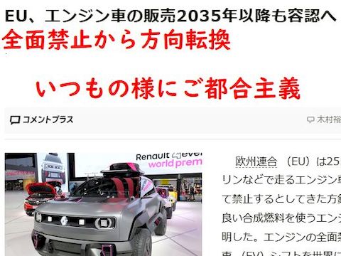 身勝手な変更ばかり、独と仏環境対策という正義の旗でEVへの全面転換(ガソリン車禁止、日本車への制裁と同じ)へと舵を切ったEUが 手のひら返しで方針変更。「合成燃料」なら良いというご都合主義の理屈、言ってみたもののEVへの完全移行は 難しいので妙な妥協案を出して来た。 |