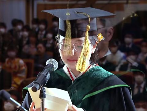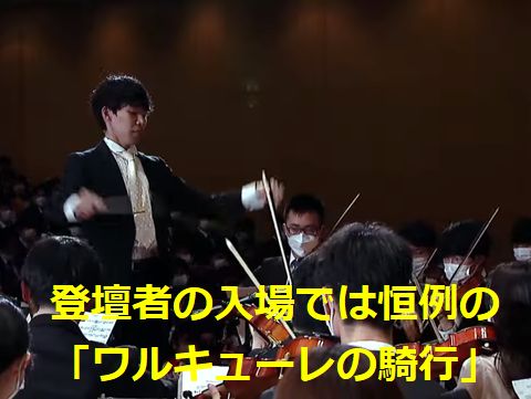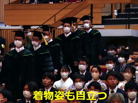 いつものオケ演奏で着物姿の女子学生も多い、学部ごとの総代も女性が目立つ。 |