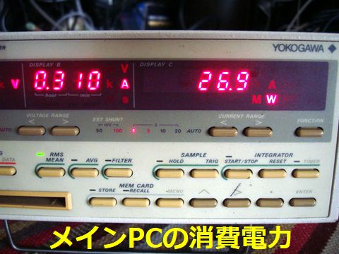 メインPCの消費電力を測定してみた表示はパラつくが上は40数ワット、下は25ワット程度と意外な少なさに驚き。 確かにSSD+HDDだがビデオカードも増設無しで最小電力レベルで実に省エネ。 |