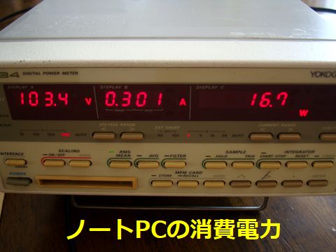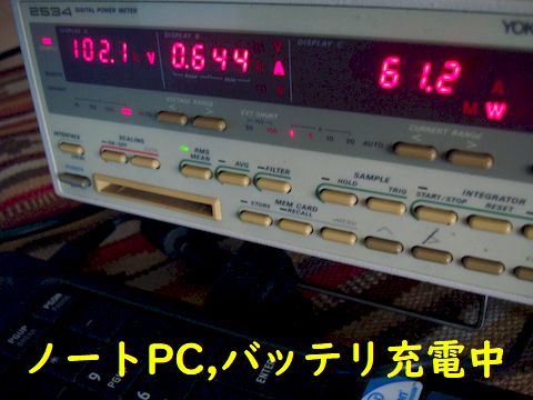 常用ノートPCの消費電力は?大きく振れるがバッテリを充電していない時は30数ワットから一桁まで、何故か力率は良くない(0.5程度)。 |