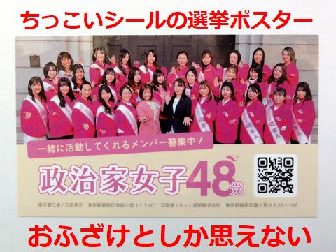 県知事選のポスターに違和感大ポスタースペースにいたずらかと思えるような小さなシール、「政治家女子48党」とはまったくフザケタ党名。 NHK・・党から始まり、次々と党名を換え、ガーシーの悪評で党首は形だけ責任を取って交代したが、何の反省も無さそう。 |