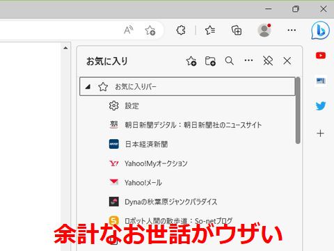 ウザいブラウザ、MS EDGEアップデートの度に検索エンジンを勝手にBingに変えてしまう勝手さ、最近のアップデートでは右サイドバーが五月蠅い。 他にも設定を勝手に初期化してしまったりと大迷惑が多い。 |
