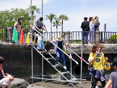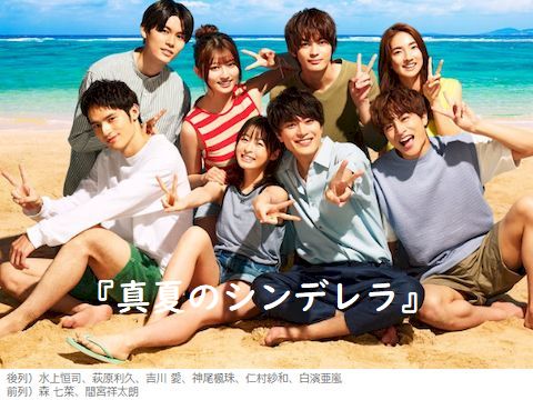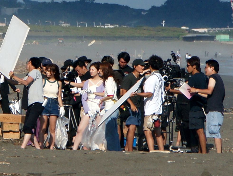 海岸で月9ドラマの撮影:フジテレビ「真夏のシンデレラ」7月スタートの月9ドラマ、主演は森七菜・間宮祥太郎のよう、一番左端の女性が主演の森七菜かな? |