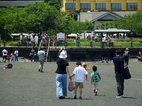 広く砂の道ができていた上陸用の仮設階段も設置、でも台風で足元の砂が流されて最上段のステップが高くなっていて子供には登り つらくなっていた。 |